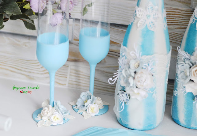 На самих бутылках по кругу пустила широкое кружево, украсила цветами и добавила веточки кудряшки